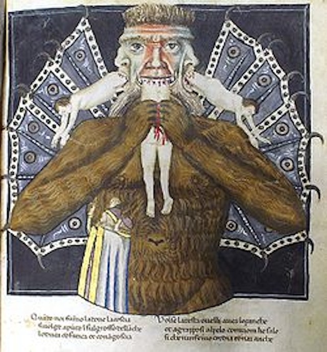 Rappresentazione del Lucifero dantesco con tre volti, intento a masticare i tre traditori