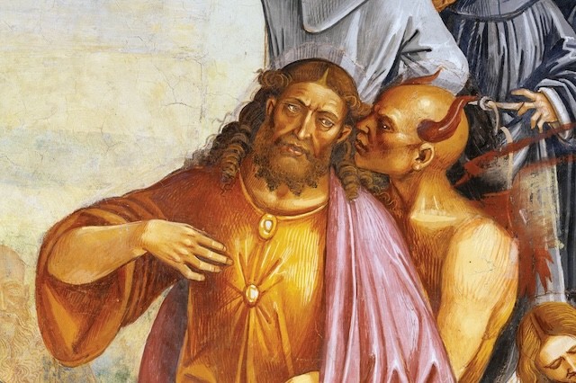 L'anticristo, consigliato dal Diavolo, che parla al popolo in un dipinto di Luca Signorelli